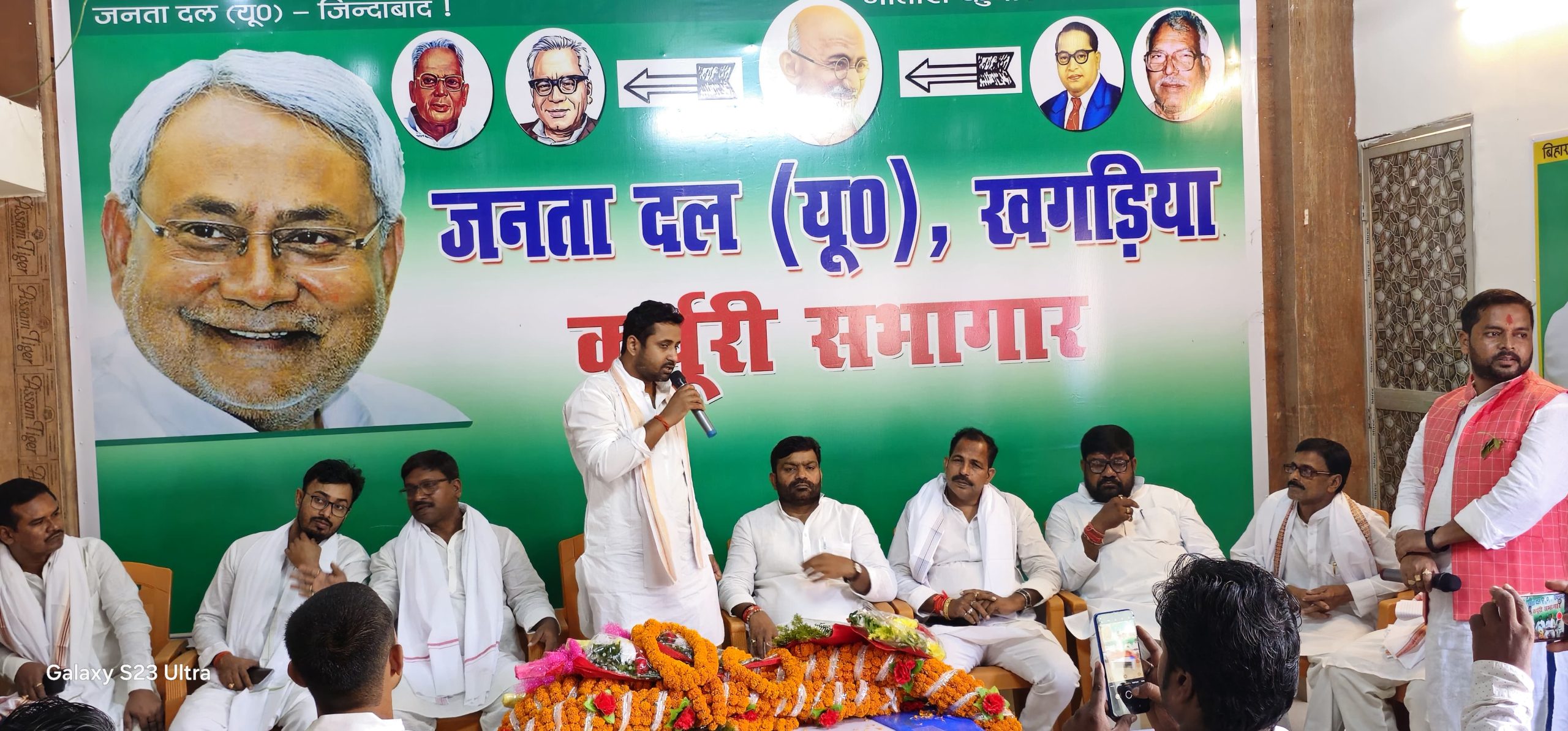 खगड़िया।मुख्यमंत्री नितीश कुमार 2025 में फिर बिहार के मुख्यमंत्री बनेगें। उक्त बातें शहर के कचहरी रोड स्थित जदयू कार्यालय के कर्पूरी सभागार में युवा जदयू के द्वारा एक दिवसीय सांगठनिक संवाद कार्यक्रम युवा जद यू के प्रदेश अध्यक्ष नीतीश पटेल ने कहा। नितीश ने पंचायत स्तर पर संगठन को मजबूत करने का भी मंत्र सिखाया। वहीं प्रभारी पूर्व विधायक वशिष्ठ सिंह ने युवाओं में सांगठनिक गति लाने के लिए उनके जिम्मेवारी का एहसास कराते हुए कहा कि घर- परिवार के लिए संसाधन पूर्ति करने के साथ संगठन की मजबूती के लिए रूचि रखें तभी आगे बढ़ सकते हैं।चुकि युवा ही पार्टी संगठन के मजबूत आधार हैं।आप युवाओं के बल पर ही हम 2025 में 225 पार करेंगे।वहीं जदयू के जिला अध्यक्ष बबलू कुमार मंडल ने अपने संबोधन में आगत अतिथियों का स्वागत करते हुए युवा जदयू संगठन की मजबूती के लिए अपनी सहभागिता कायम रखने की बात बताया। युवा जदयू के जिला अध्यक्ष सावन कुमार बन्टी ने प्रदेश नेतृत्व के निर्देश के आलोक में जल्द ही पंचायत स्तरीय संगठन तैयार करने की बात कही।जबकि मंच संचालन जिला जद यू प्रवक्ता राकेश पासवान शास्त्री ने किया। इस अवसर पर युवा जदयू के प्रदेश उपाध्यक्ष नरेश दांगी,कृष्णदेव कुशवाहा,प्रशांत राज,प्रदेश सचिव सुशांत पटेल,जिला उपाध्यक्ष पंकज कुमार पटेल, उमेश सिंह पटेल ,महासचिव मनोज कुमार सिंह,पंकज कुमार सिंह,पंकज कुमार चौधरी,संजय कुमार सिंह उर्फ पप्पू देव ,रवि पटेल,प्रदेश मीडिया प्रभारी रोहित राज,प्रखण्ड अध्यक्ष रामप्रकाश सिंह, राजनीति प्रसाद सिंह,संजय सिंह कुशवाहा,छात्र जिला अध्यक्ष सिद्धांत सिंह छोटू ,युवा जदयू के पदाधिकारियों में बिक्रम कुमार शर्मा,आदित्य पटेल ,ऋषभ कुमार ,जयजयराम कुमार, नवनीत कुमार, किरणदेव करण,रणविजय सिंह, कुमार सानू,राजीव कुमार, दीपक कुमार सिंह,मनीष कुमार सिंह,रंजन कुमार,अमित कुमार गौतम,आनंद चौधरी एवं राजीव कुमार ठाकुर आदि सैकडों की संख्या में युवा कार्यकर्त्ता उपस्थित थे।