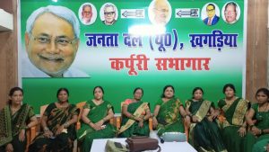 खगड़िया।जदयू महिला प्रकोष्ठ द्वारा रविवार को कचहरी रोड स्थित जदयू कार्यालय के कर्पूरी सभागार में हरियाली महोत्सव का आयोजन किया गया। जिसकी अध्यक्षता केन्द्रीय लोक शिकायत आयोग की राज्य अध्यक्ष सह जदयू नेत्री वीणा पासवान ने की। जबकिमंच संचालन जदयू जिला उपाध्यक्ष निर्मला कुमारी ने किया। वीणा पासवान ने कहा कि मुख्यमंत्री नीतीश कुमार के कुशल नेतृत्व में महिलाओं को अभूतपूर्व ऊर्जा और सशक्तिकरण प्राप्त हुआ है। उन्होंने कहा कि जिस प्रकार सावन की हरियाली प्रकृति में नवजीवन भरती है, उसी तरह मुख्यमंत्री नीतीश कुमार ने महिलाओं को आत्मनिर्भर बनाने के लिए नई चेतना दी है। महिलाएं आज हर क्षेत्र में आगे बढ़ रही हैं, यह नीतीश सरकार की नीति और नीयत का परिणाम है। इधर चर्चित जद यू नेत्री अनुराधा कुमारी कुशवाहा ने कहा की विधानसभा चुनाव 2025 में महिलाएं एकजुट होकर नीतीश कुमार को फिर से मुख्यमंत्री बनाएंगी।अनुराधा कुशवाहा ने कहा की नितीश सरकार में महिलाओं का जो सम्मान मिला है, वह किसी पार्टी में नहीं है। अनुराधा ने कहा की मुख्यमंत्री नितीश सरकार जल-जीवन-हरियाली अभियान, महिला सशक्तिकरण, शराबबंदी, मुख्यमंत्री बालिका साइकिल योजना, नौकरी में 33% आरक्षण, पंचायतीराज में 50% आरक्षण, जीविका दीदी, आशा-ममता कार्यकर्ताओं का मानदेय वृद्धि,125 यूनिट फ्री बिजली सहित कई ऐतिहासिक कार्य किये हैं। कार्यक्रम को नीलम वर्मा, साधना देवी सदा निर्मला कुमारी ने भी संबोधित किया। मौके पर जदयू जिला महासचिव पार्वती देवी, पूनम जयसवाल, मुन्नी जयसवाल, रीता कुमारी, मीरा कुमारी, रिंकू देवी, रेखा कुमारी, किरण कुमारी, कोमल कुमारी, वंदना कुमारी सहित दर्जनों जदयू महिला कार्यकर्ता उपस्थित थी।
